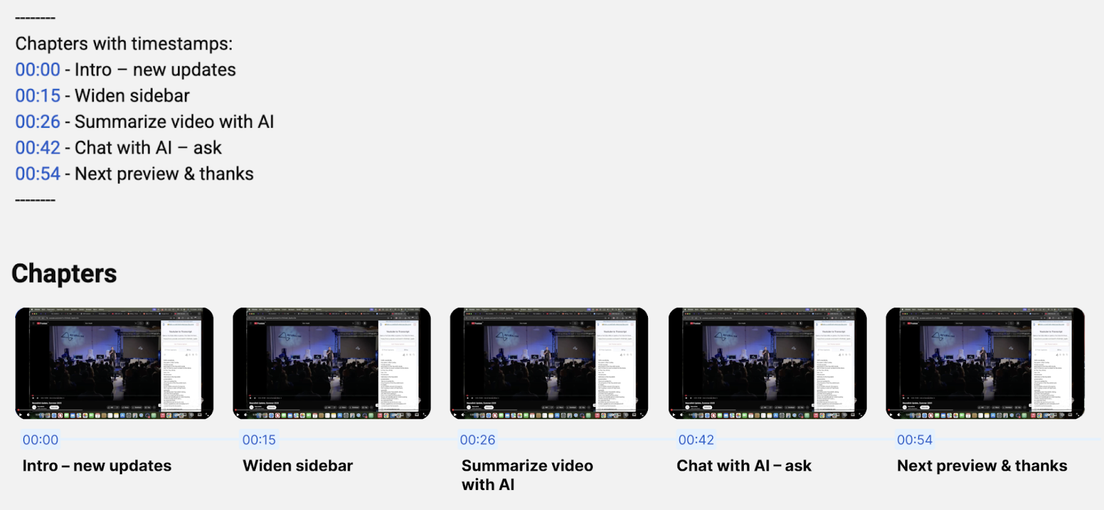 Сервис автоматически возьмет транскрибацию вашего видео, разобьёт его на смысловые блоки и сгенерирует SEO — оптимизированные главы с временными метками